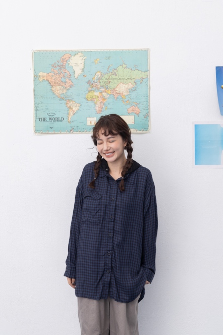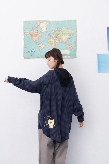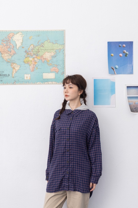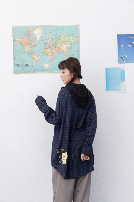 【maru.a】文青格紋拼接連帽襯衫(2色)- 丈青 24933212