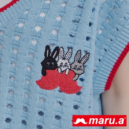 【maru.a】三隻咪兔🐰刺繡撞色滾邊洞洞針織V領背心(2色)-淺藍 23914216