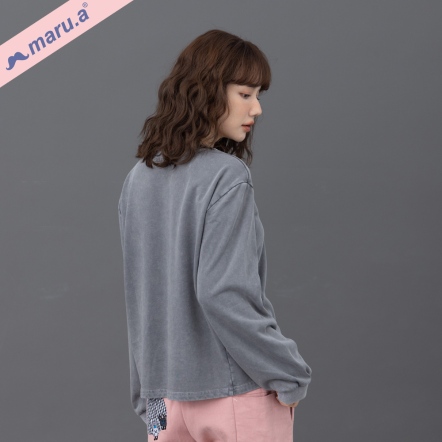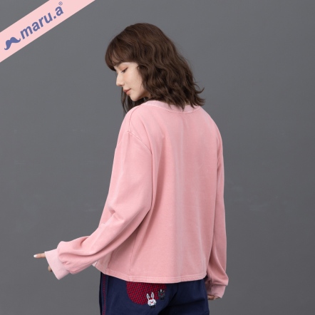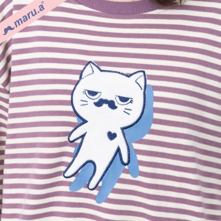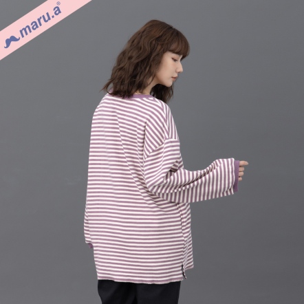 【maru.a】爽爽貓miru🛏️撞色刺繡條紋滾邊口袋蓬袖長版上衣(2色)-深紫 23931312