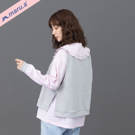 【maru.a】浪漫鐵塔🗼假兩件拼接條紋附荷葉領片上衣(2色)-深灰 23923115