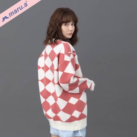 【maru.a】特殊設計款💫滿版字母撞色菱格紋厚磅小花毛衣(3色)-桃紅 23914214
